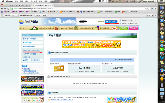 先由藍色マイル通帳進到這個畫面,然後點選受信メールの設定變更除了"ネットマイルからの重要なお知らせ"以外,其他都可以取消集點方式